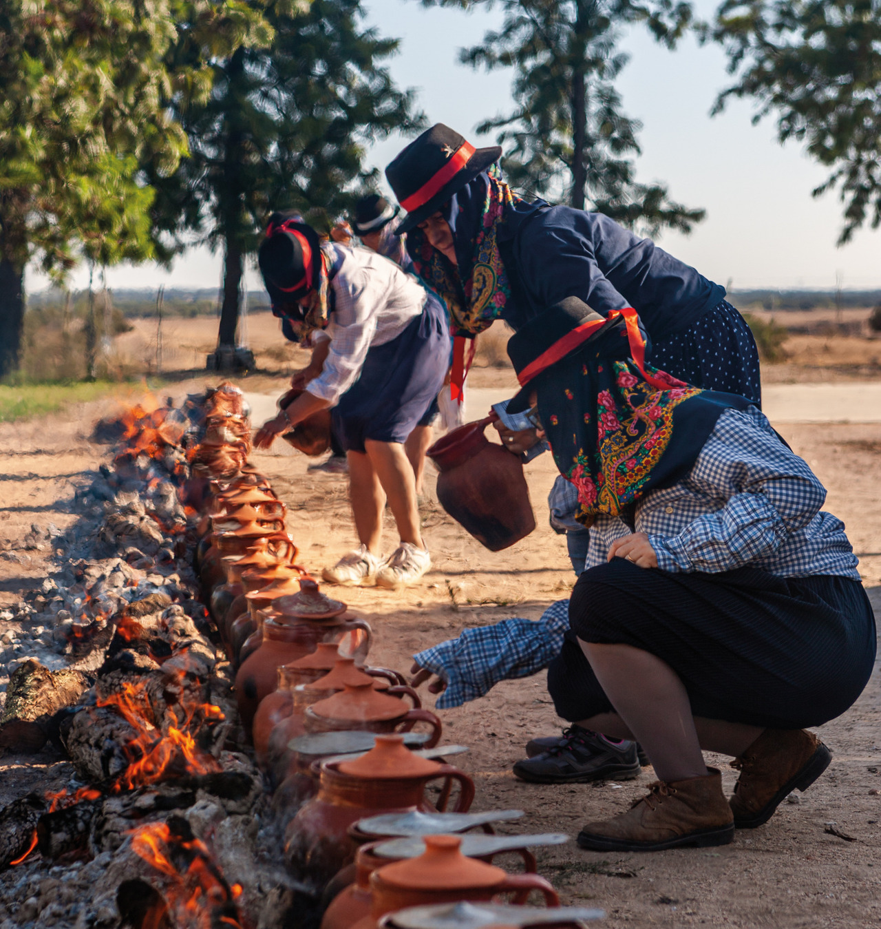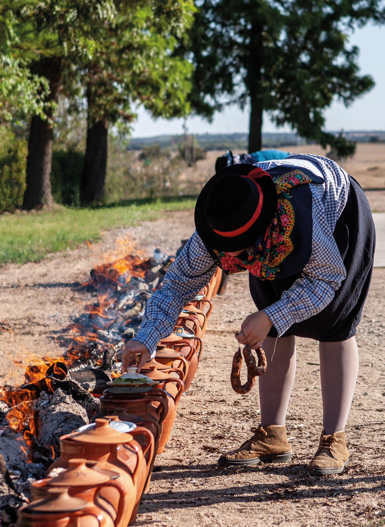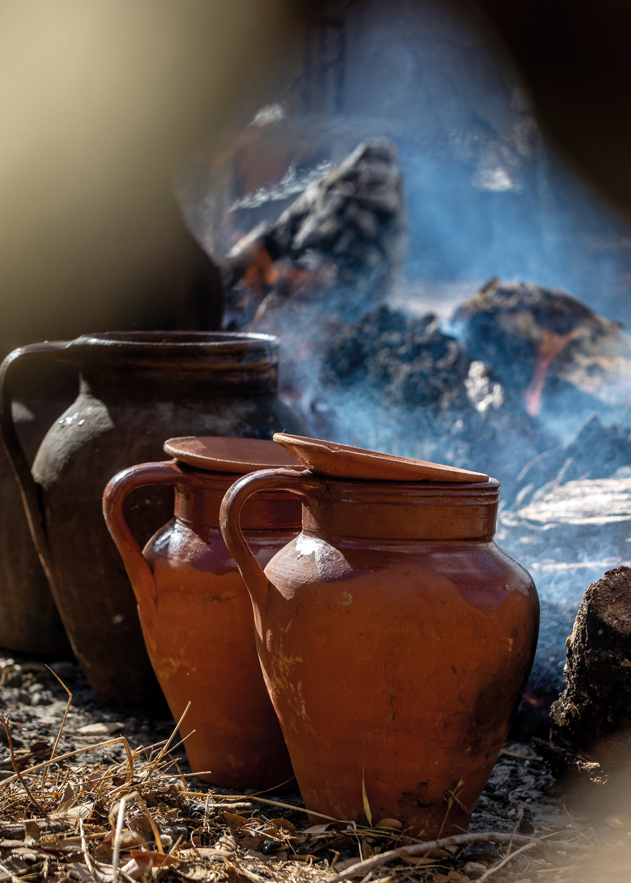Not far from here, in the shade of an old holm oak tree, the cocaria was a row of clay pots nestled in the embers, kindled with whatever wood was on hand. A woman, whose task it was to oversee this communal cooking, would occasionally give each pot a convenient turn, an operation that involved taking it by the handle and giving it a quick, sharp shake, so that whatever was on the bottom would move to the top and whatever was on top would do the opposite. There it was, simmering softly, almost ready, waiting for midday, the men’s meal. Among the lineup, a larger pot stood out. It belonged to her and her husband, who was nearby, threshing.